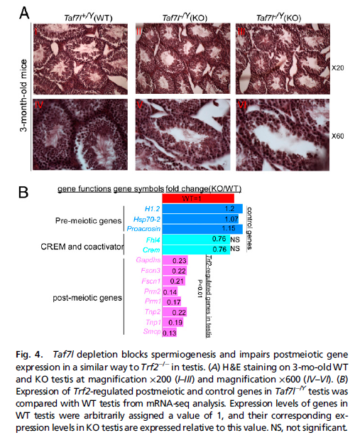 2. Abstract TATA-binding protein (TBP)-associated factor 7l (Taf7l; a paralogue of Taf7) and TBP-related factor 2 (Trf2) are components of the core promoter complex required for gene/tissue-specific transcription of protein-coding genes by RNA polymerase ... TATA-binding protein (TBP)-associated factor 7l (Taf7l; a paralogue of Taf7) and TBP-related factor 2 (Trf2) are components of the core promoter complex required for gene/tissue-specific transcription of protein-coding genes by RNA polymerase II. Previous studies reported that Taf7l knockout (KO) mice exhibit structurally abnormal sperm, reduced sperm count, weakened motility, and compromised fertility. Here we find that continued backcrossing of Taf7l(-/Y) mice from N5 to N9 produced KO males that are essentially sterile. Genome-wide expression profiling by mRNA-sequencing analysis of wild-type (WT) and Taf7l(-/Y) (KO) testes revealed that Taf7l ablation impairs the expression of many postmeiotic spermatogenic-specific as well as metabolic genes. Importantly, histological analysis of testes revealed that Taf7l(-/Y) mice develop postmeiotic arrest at the first stage of spermiogenesis, phenotypically similar to Trf2(-/-) mice, but distinct from Taf4b(-/-) mice. Indeed, we find that Taf7l and Trf2 coregulate postmeiotic genes, but none of Taf4b-regulated germ stem cell genes in testes. Genome-wide ChIP-sequencing studies indicate that TAF7L binds to promoters of activated postmeiotic genes in testis. Moreover, biochemical studies show that TAF7L associates with TRF2 both in vitro and in testis, suggesting that TAF7L likely cooperates directly with TRF2 at promoters of a subset of postmeiotic genes to regulate spermiogenesis. Our findings thus provide a previously undescribed mechanism for cell-type-specific transcriptional control involving an interaction between a "nonprototypic" core promoter recognition factor (Trf2) and an orphan TAF subunit (Taf7l) in mammalian testis-specific gene transcription.