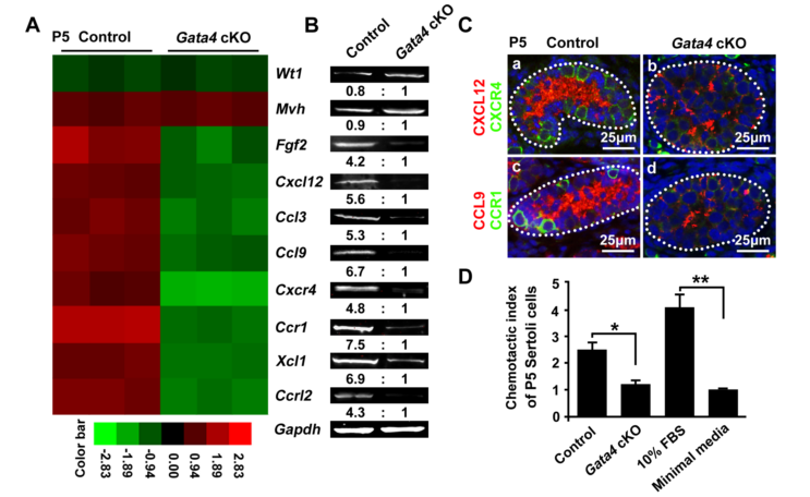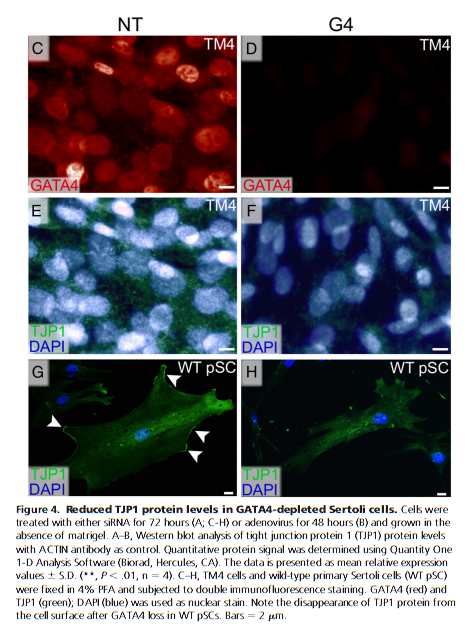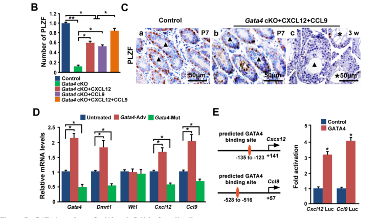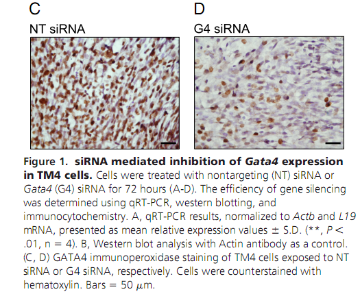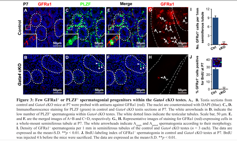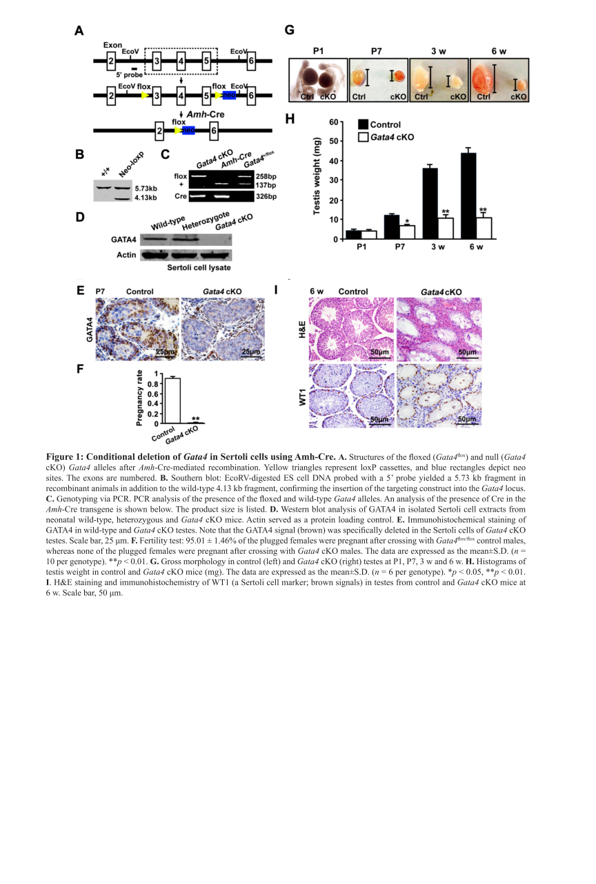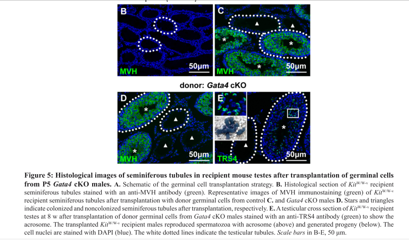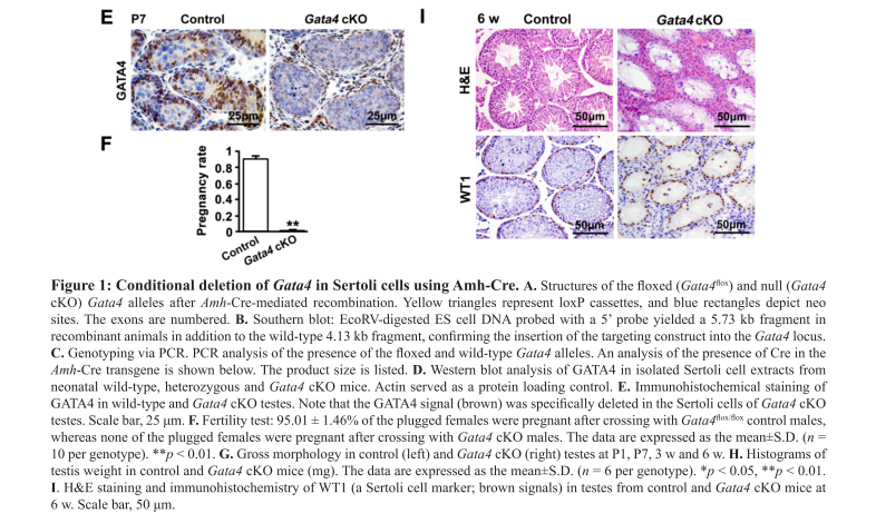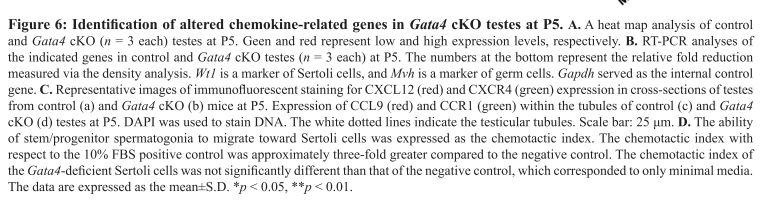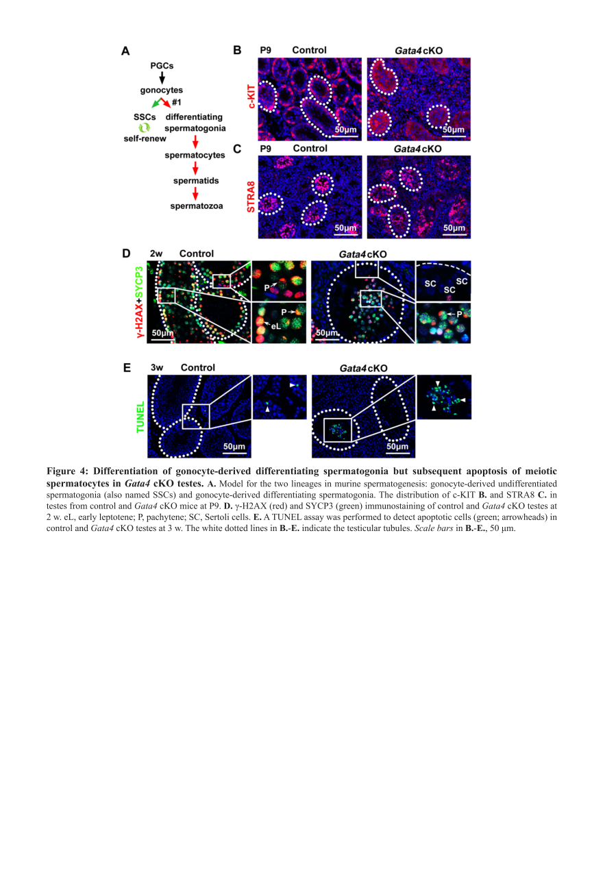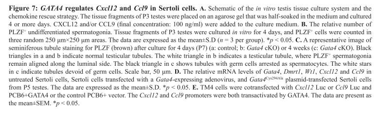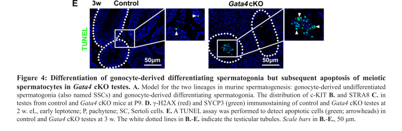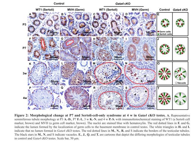 Chen, S. R., Tang, J. X., Cheng, J. M., Li, J., Jin, C., Li, X. Y., Deng, S. L., Zhang, Y., Wang, X. X. and Liu, Y. X. (2015) Loss of Gata4 in Sertoli cells impairs the spermatogonial stem cell niche and causes germ cell exhaustion by attenuating chemokine signaling. Oncotarget 6(35): 37012-27. PMID: [26473289]