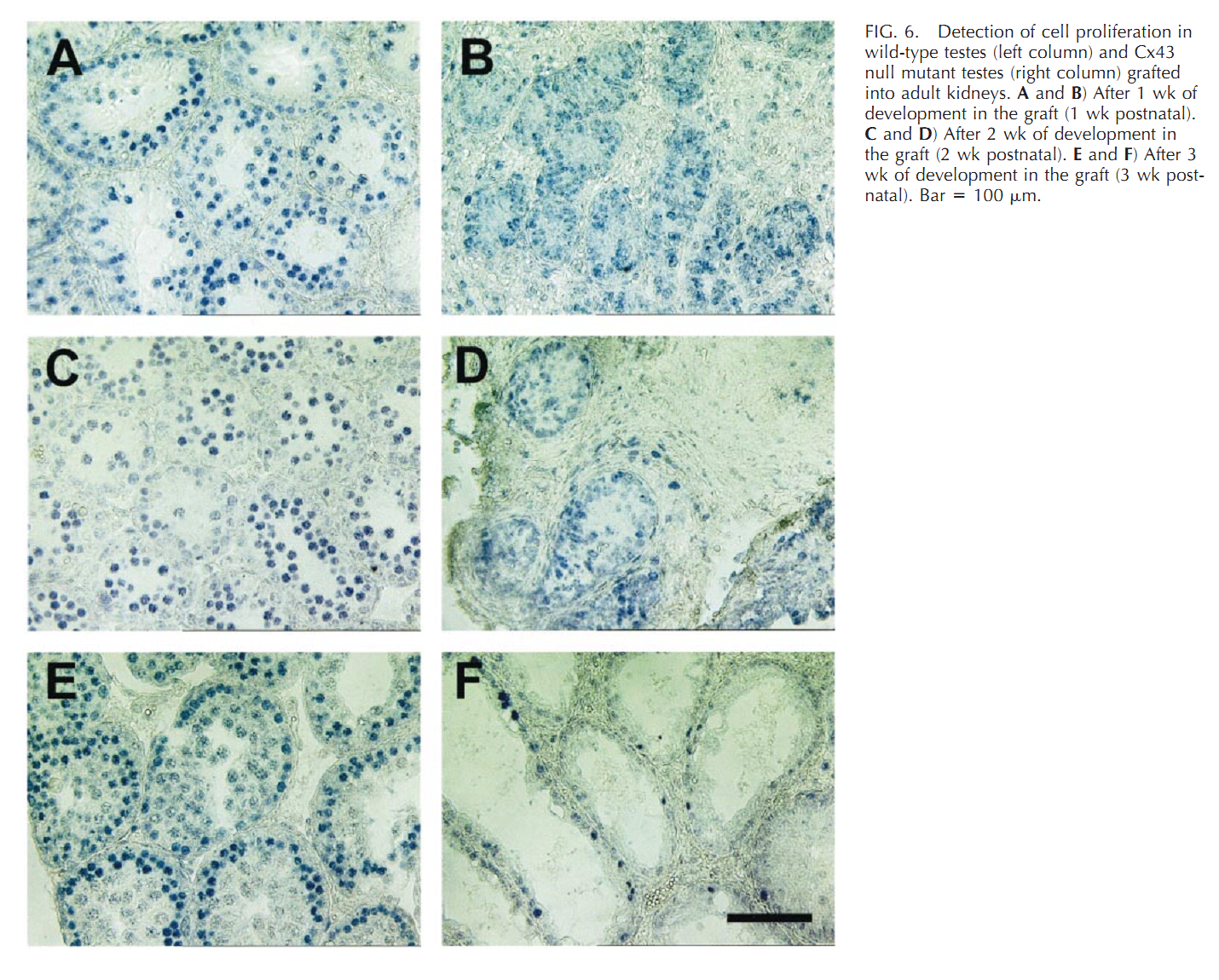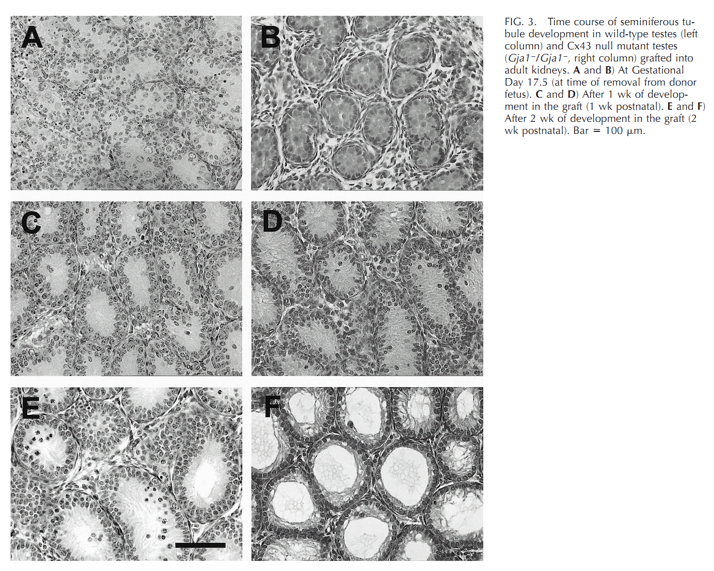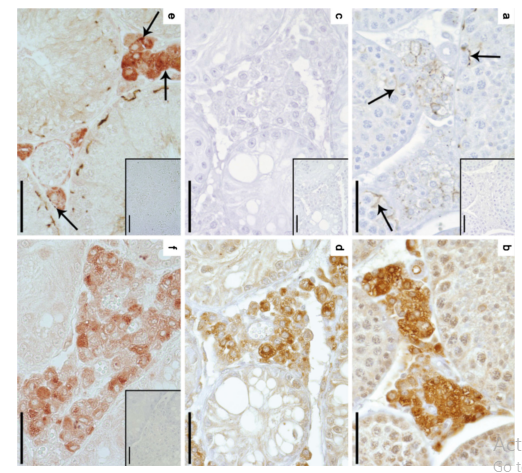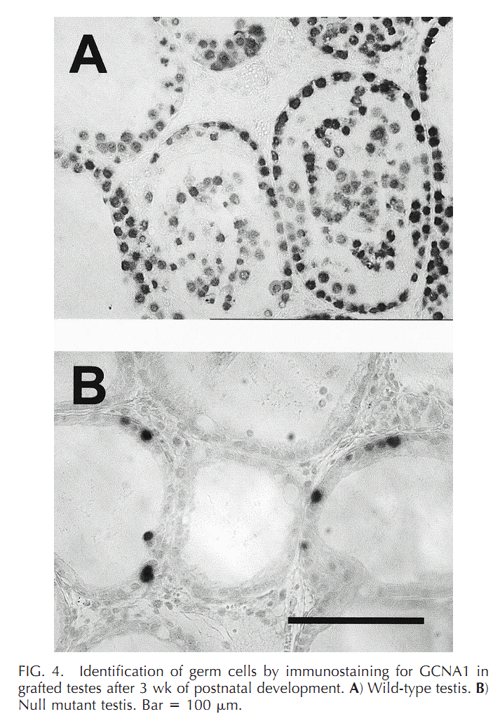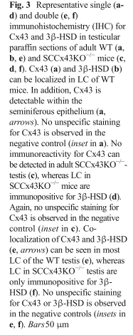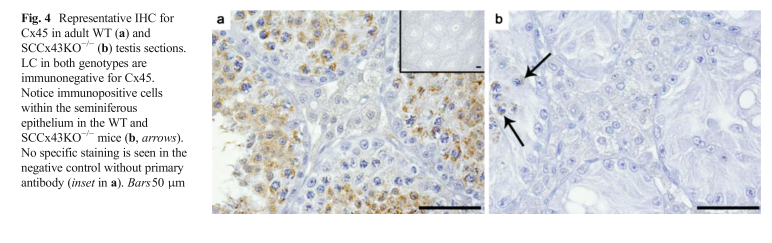 | Cx43 (Gja1) is the predominant testicular Cx and is expressed by the Sertoli cells, germ cells , peritubular cells, and. Cx43 has been demonstrated to be involved in SC proliferation and differentiation; it plays an essential role in the initiation and maintenance of spermatogenesis and is possibly involved in the steroidogenesis of interstitial Leydig cells. | |