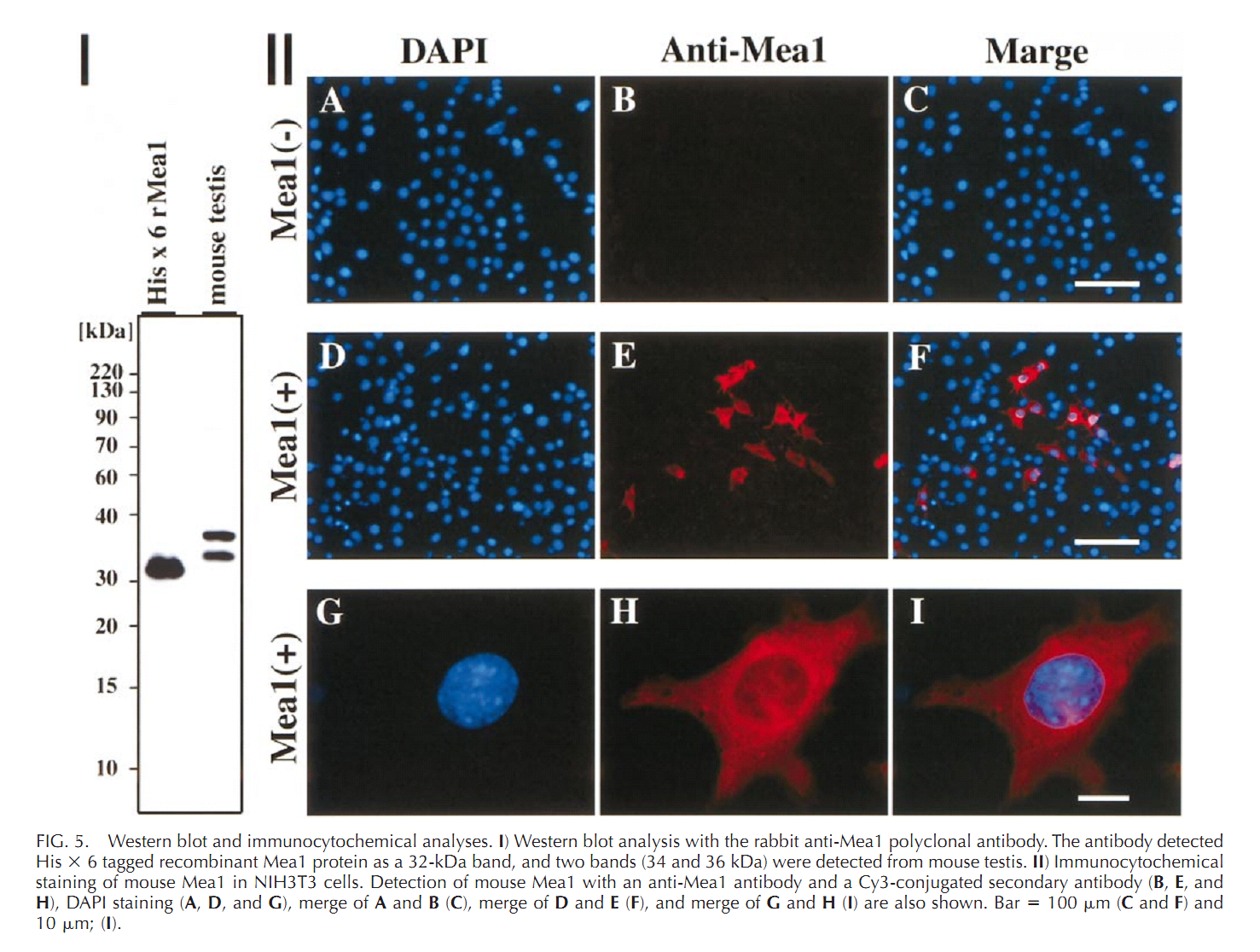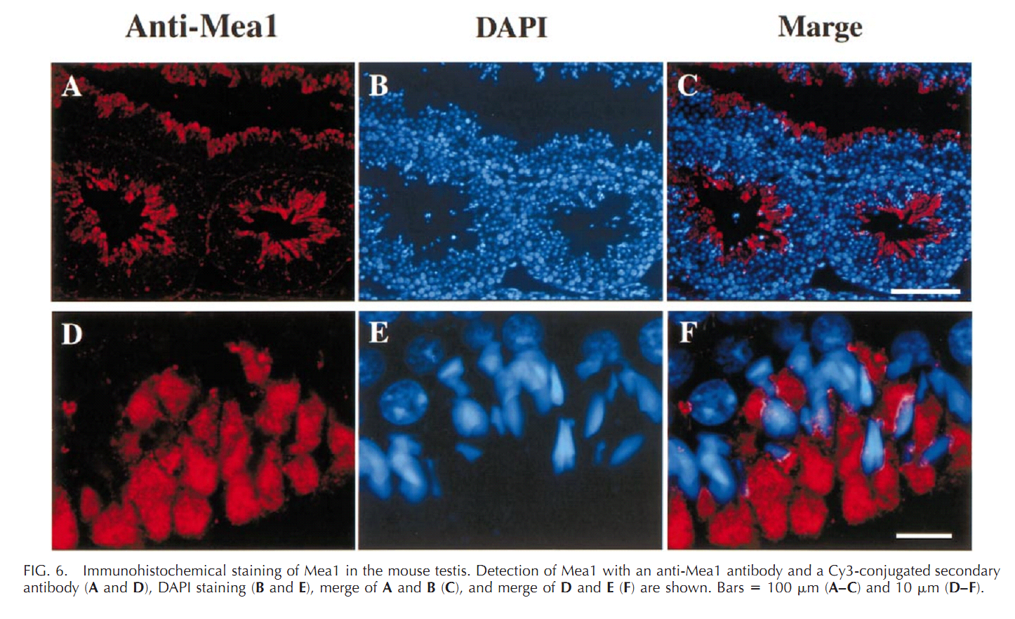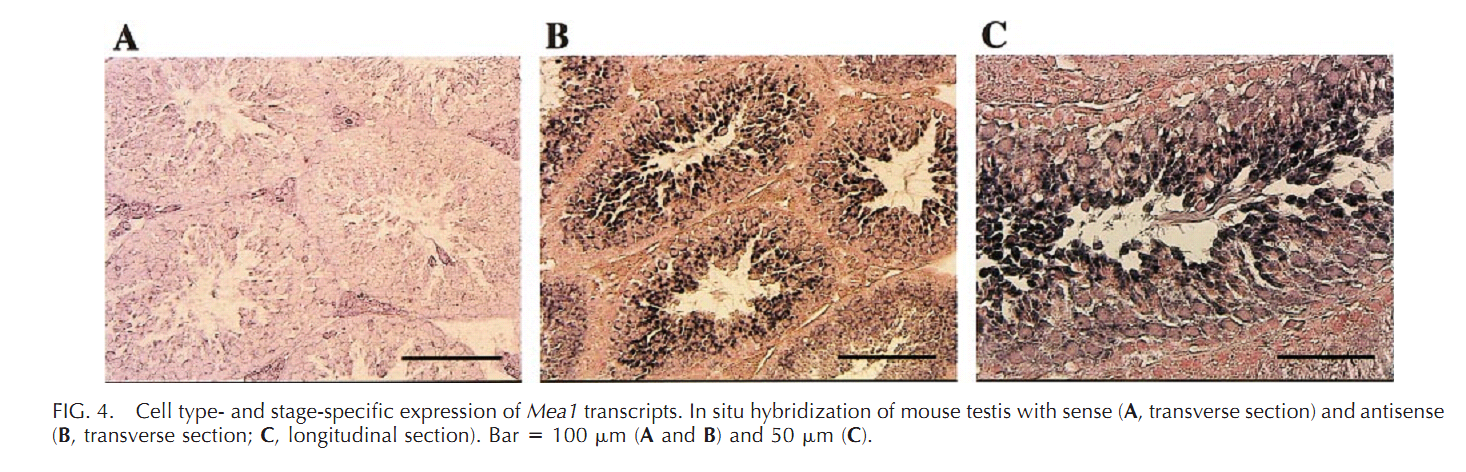 | Male-enhanced antigen-1 gene flanked by two overlapping genes is expressed in late spermatogenesis, and is highly expressed in testis. | |