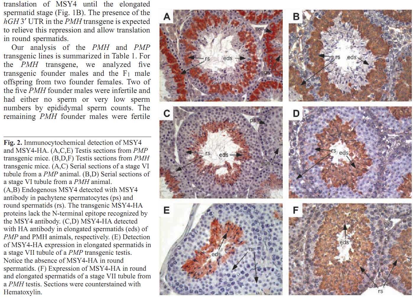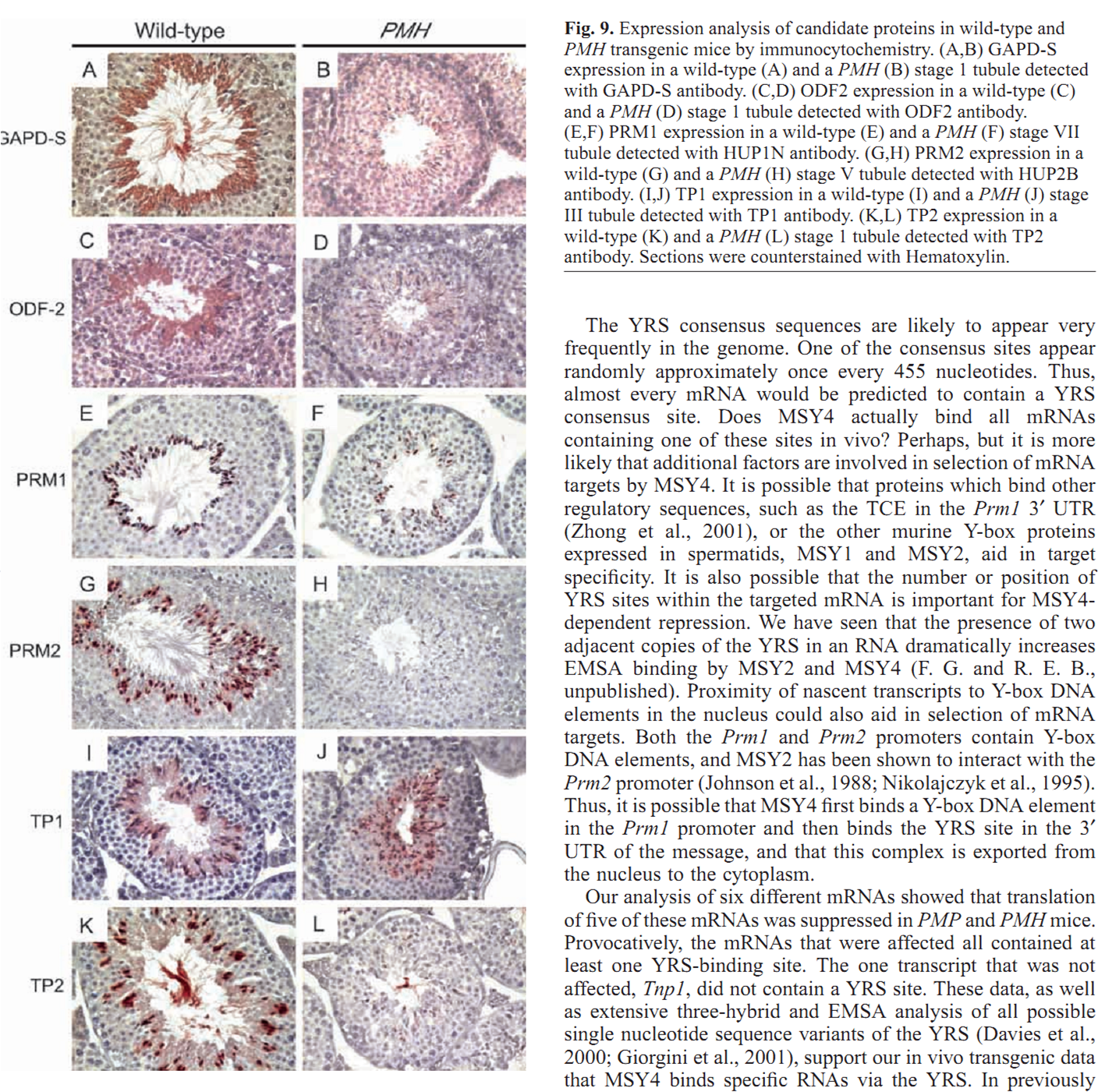 2. Abstract Y-box binding proteins, a large family of proteins, are involved in a variety of functions. The present study describes the expression of YB2, a rat Y-box binding protein, and/or RYB-a, an alternatively ... Y-box binding proteins, a large family of proteins, are involved in a variety of functions. The present study describes the expression of YB2, a rat Y-box binding protein, and/or RYB-a, an alternatively spliced product of the YB2 gene during spermatogenesis. YB2/RYB-a is thought to be the rat orthologue of mouse Y-box protein 3 (MSY3). An antibody which recognizes YB2/RYB-a was developed and applied in an immunochemical study of rat and mouse testes. We also carried out an in-situ hybridization study and Northern blot analysis of YB2/RYB-a and protamine 2 mRNA expression. Both YB2/RYB-a mRNA and the proteins appeared in prepubertal mouse testes, prior to the expression of the mouse protamine 2 mRNA. The mRNA and protein were present at high levels in spermatocytes, decreased in round to elongated spermatids, and were absent in spermatozoa. Since the protamine 2 mRNA was present at high levels in round and elongating spermatids, the proposed function of the YB2/RYB-a protein as a translational repressor of the mRNA was supported in mouse. The level and localization of YB2/RYB-a mRNA and protein expression in the rat testis was comparable to that in mouse testis, although rat testis is known to express a very low level of protamine 2, but is also likely to affect the expression of other proteins (including protamine 1) during spermatogenesis.