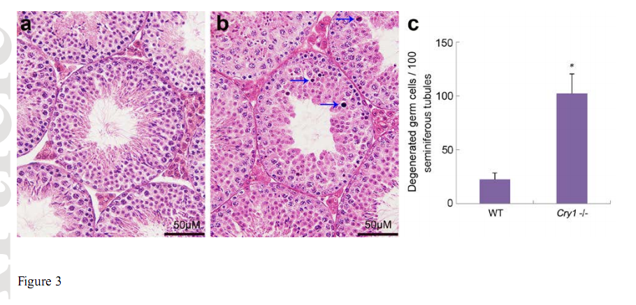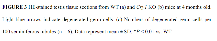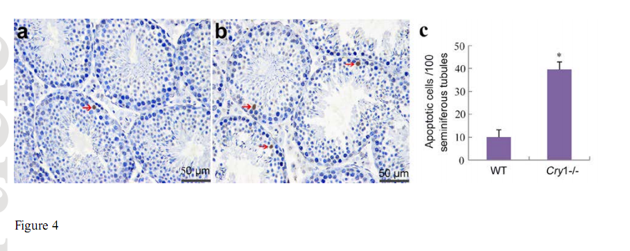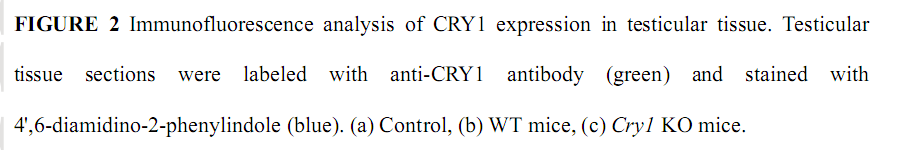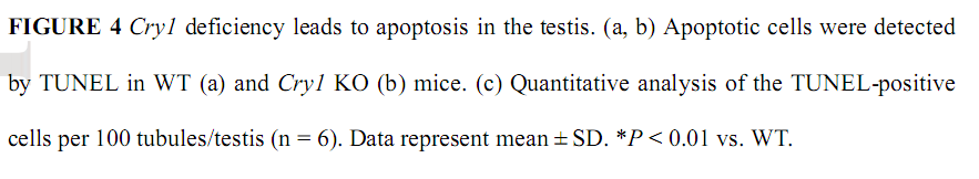 Cryptochrome (Cry)1 is essential for generating circadian rhythm in central and many peripheral oscillators. Cry1 is necessary for normal testicular function and its deficiency increased testicular germ cell apoptosis and decreased sperm count. Dysregulation of Cry1 and male reproductive defects in mice, indicating that Cry1 plays a critical role in maintaining normal testicular function.